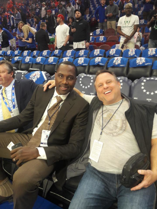 | On set at Universal with Ted Danson and Kristen Bell from The Good Place. | With Kenny Griswold and Bethenny Frankel at Sundance in Park City , UT. | With my pal Elton Brand ( 76ers GM ) at a ball game in Philly. |